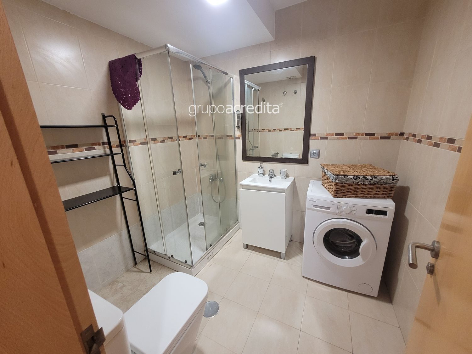- Baño completo formado por lavabo con mueble de almacenaje y espejo, inodoro, plato de ducha con mampara y lavadora